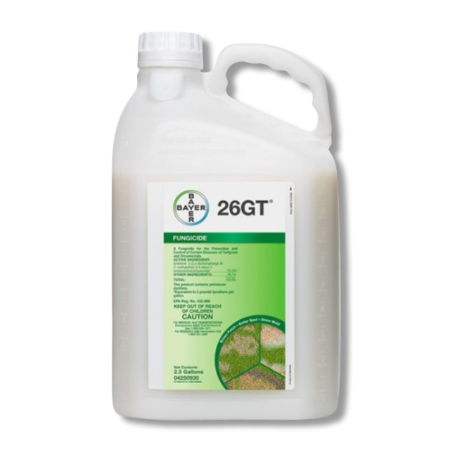 26GT Fungicide, manufactured by Bayer, is a broad-spectrum fungicide that provides excellent control on a large number of turf and ornamental diseases. Once applied, this product continues to prevent disease growth with its long residual rate of 14 days or longer.