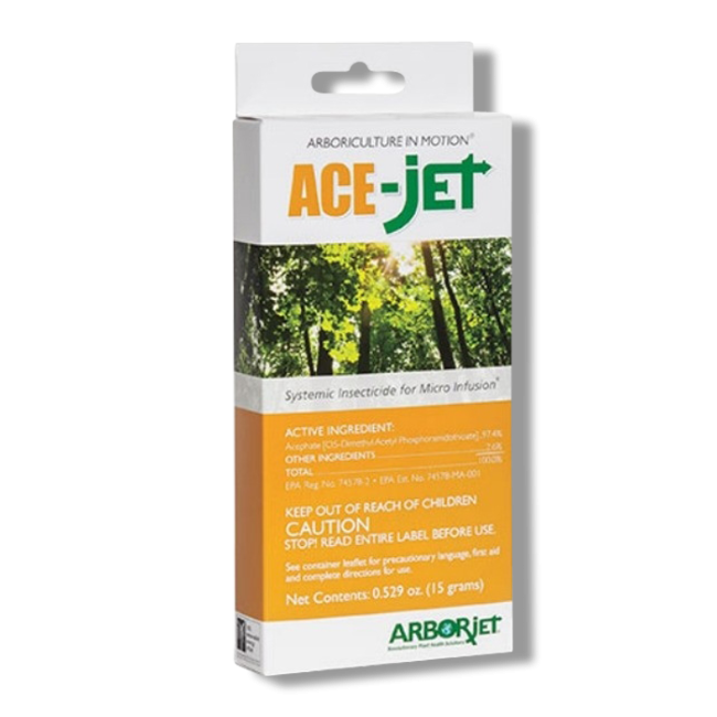 ACE-Jet Systemic Insecticide, manufactured by Arborjet, is a effective micro-injectable and micro-infusible insecticide with control over a broad-spectrum of pests for agricultural and commercial trees and landscape ornamentals like shrubs and palms.