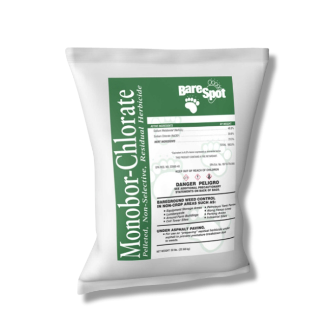 - Step 1: Determine how much BareSpot Monobor-Chlorate you will need by calculating the square footage of the area to be treated. To do this, measure the length and width of the treatment area then multiply them together (length X width = square footage). The application rate for general weed control is 2 lbs. of BareSpot Monobor-Chlorate per 100 sq. ft.. For perennial weed control, use 4 lbs. of product per 100 sq. ft. For use as "prepaving" residual herbicide under asphalt paving then apply 2-4 lbs of product per 100 sq. ft. as a dry application. If you wish to use a spray application of this product, dissolve 1-2 lbs. of product per gallon of water and apply 11/2-2 gallons per 100 sq. ft. Where surfacing has already been cracked by emergent vegetation, inject BareSpot Monobor-Chlorate in a solution of 2 lbs. per gallon of water.