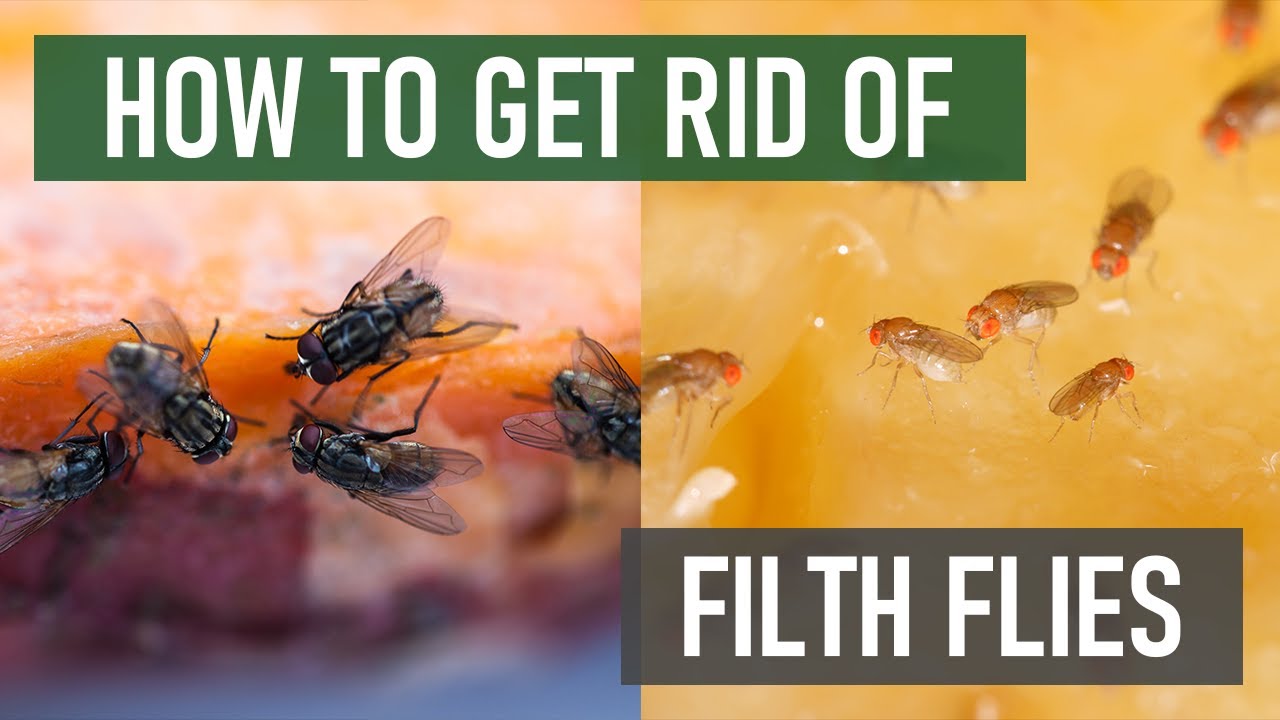 - Filth flies are pests that feed and travel on decomposing matter that holds several harmful diseases and pathogens. Filth flies fall into two groups called large filth flies or small filth flies. The first group is more likely to infest garbage, manure, and dead animals whereas the second group tends to frequent organic debris, such as plant material that is decaying, along with debris in drains.
