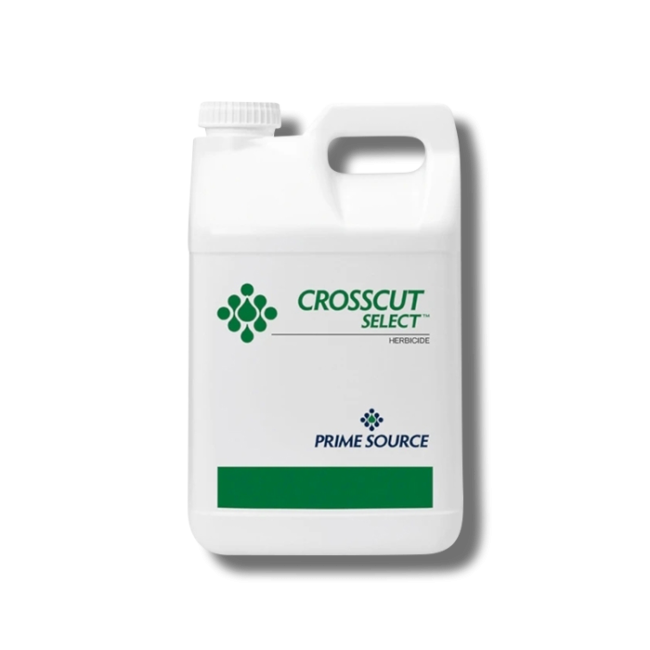 CrossCut Select, manufactured by Prime Source LLC, is a selective post-emergent herbicide that contains 2,4-D 34.40% and Triclopyr 16.50%, which kills the hardest to control plants by interfering with their growth leading to the treated plants death.