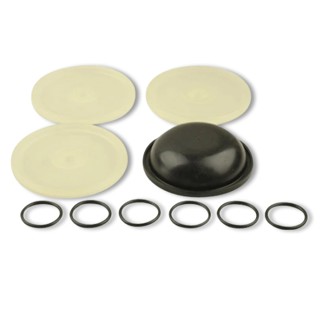 The Hypro D115 repair kit includes the following: 3 desmopan diaphragms, 1 accumulator diaphragm and 6 o-rings for the pump heads.