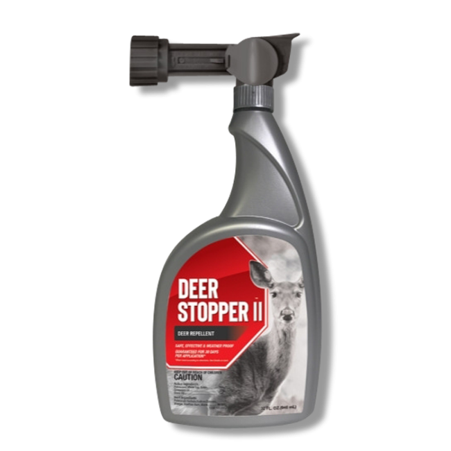 Deer Stopper ll Repellent Hose End Spray is a non-toxic and easy to use liquid deer repellent that effects the animals taste, touch, and smell before they consume plants and not after. This product will not leave behind any offensive odors nor will it stain treated foliage as it dries clear within 20 minutes of application.