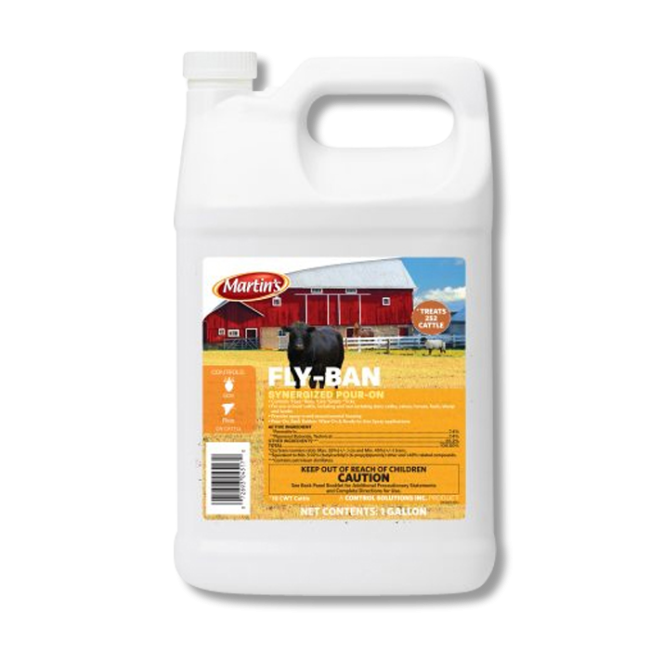 Martin's Fly-Ban Synergized Pour-On is an application that can be poured on or rubbed onto beef cattle, horse, sheep and lambs to control flies, gnats, keds and lice. The product contains a combination of Permethrin and Piperonyl Butoxide which are safe on the skin of the mentioned farm animals. Fly-Ban can also be used as a premise spray around livestock areas and can be sprayed onto surfaces to act as a residual killer of these same pests.