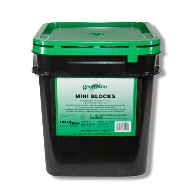 Generation Mini Blocks, manufactured by Lipha Tech, are single-feeding rodenticide baits designed to control invasions of house mice, Norway rats, and roof rats within 4 days of application.