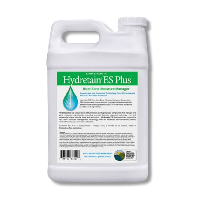 Hydretain ES Plus, manufactured by Ecologel Solutions, is a unique surfactant that converts soil moisture into plant usable water droplets, effectively reducing watering, dry spots, and labor for plants.