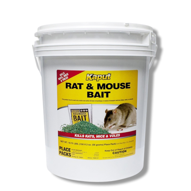 - Step 1: Determine areas of your home where you have noticed rodent activity and put place packs in these target areas, preferably inside a bait station. The number of Kaput Rat and Mouse Bait (RMV) place packs will depend on the type of rodent and the severity of the infestation being treated. For Norway and Roof rats, apply 2 to 8 of Kaput Rat & Mouse Bait (RMV) placepacks per bait placement (including deeply into rat burrows), with placements spaced at 15 to 30 foot intervals. House Mice, open pack and apply 1/4 to 1/2 oz. of bait per placement with placements spaced at 8 to 12 foot intervals. Voles, open pack and load 1 oz. (half of pack) of bait into each bait station within 50 feet of buildings.