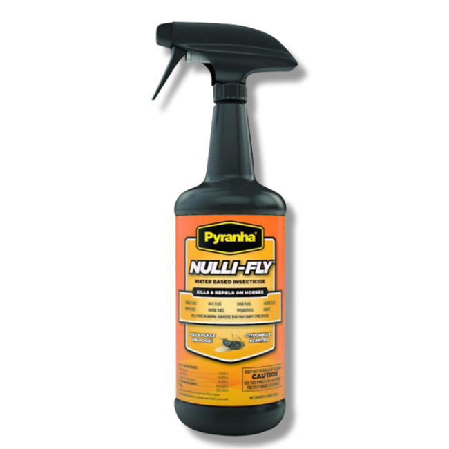 Pyranha Nulli-Fly, manufactured by Pyranha Products, is a water-based insecticide that kills and repels flying and biting insects from animal quarters, horses, and dogs.