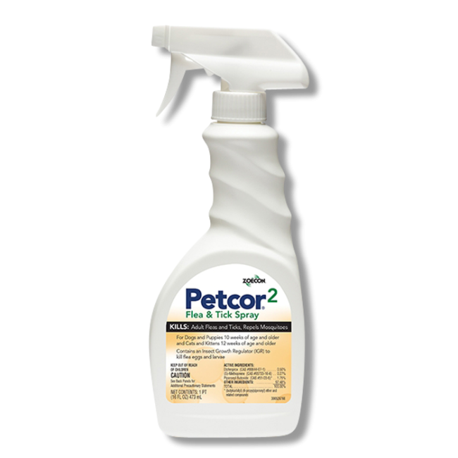 Petcor 2 Flea & Tick Spray, manufactured by Zoecon, is a ready to use flea spray that will kill fleas and ticks and will repel mosquitoes, all while being completely safe to use dogs older than 10 weeks of age and cats older than 12 weeks of age.