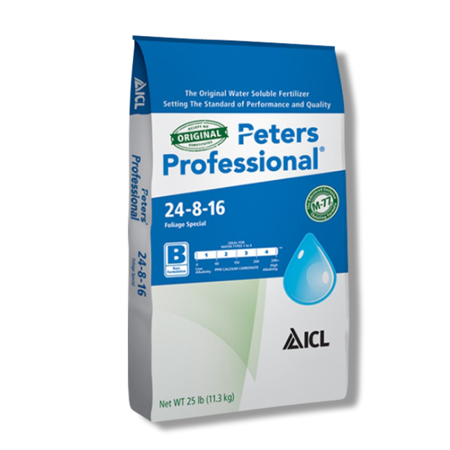 Peters Professional 24-8-16 Foliage Specials Fertilizer, manufactured by ICL Specialty Fertilizer, is a high quality water soluble fertilizer that has a low phosphate ratio to dispel a full range of essential micronutrients for interiorscapes.