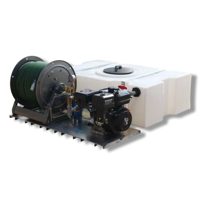 This rig comes with a Hypro 6500C-R pump, a 4HP 118cc engine with a 6:1 gear reduction, Hannay reel, 300 feet of 3/8 inch hose, and a 50-gallon low profile tank. All components are bolted to an aluminum frame that will never rust and is welded at every seam.