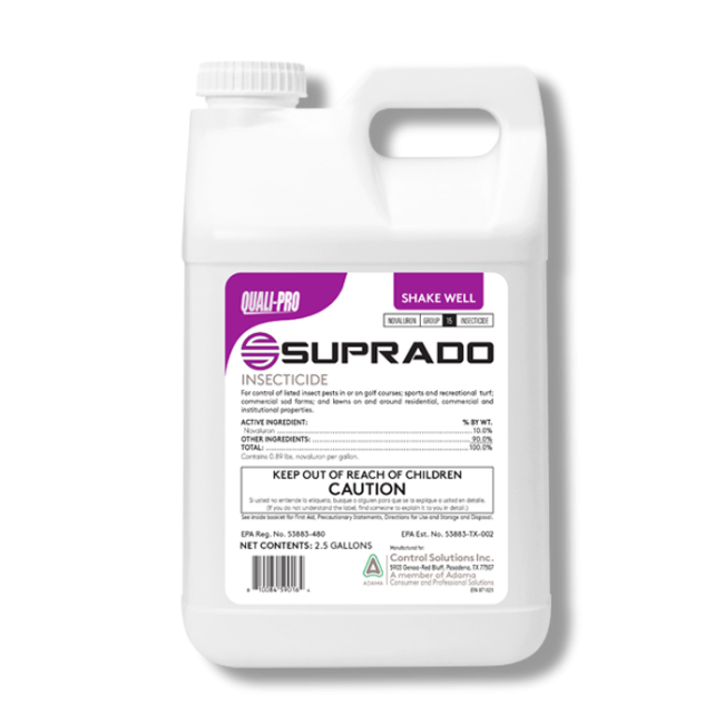 | Mix Rate | Apply Suprado IGR at the rate of 2.2 to 3 oz. of product per 2 gallons of water per 1,000 sq. ft. on turfgrass applications. For turf caterpillars on turfgrass, use 0.7 to 1.5 oz. of product per 2 gallons of water per 1,000 sq. ft. Acreage applications to turfgrass will apply between 3 to 4 quarts of product per 87.12 gallons of water per acre. |