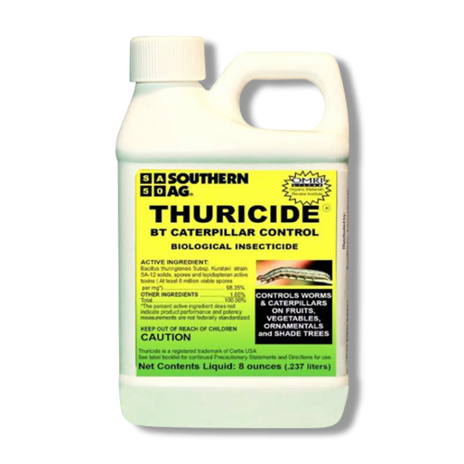 Thuricide BT Caterpillar Control, by Southern Agricultural Products, is an easy to mix, organic liquid concentrate designed to target various types of worms, caterpillars, and gypsy moths within ornamental foliage and agricultural crops (such as fruits or vegetables).