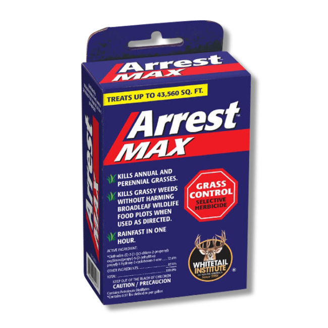 Whitetail Institute Arrest Max Herbicide, manufactured by Whitetail Institute, is a rainfast post-emergent herbicide that provides excellent control over grassy weeds without harming plants grown for wildlife food.
